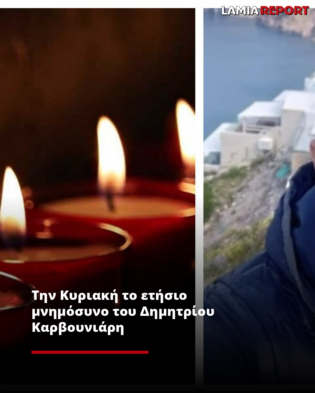 Την Κυριακή 12 Ιανουαρίου 2025 στις 09:30' το πρωί, θα τελεστεί το ετήσιο μνημόσυνο του Δημητρίου Καρβουνιάρη, στον Ιερό Ναό Αγίου Δημητρίου στην Ηράκλεια Λαμίας.