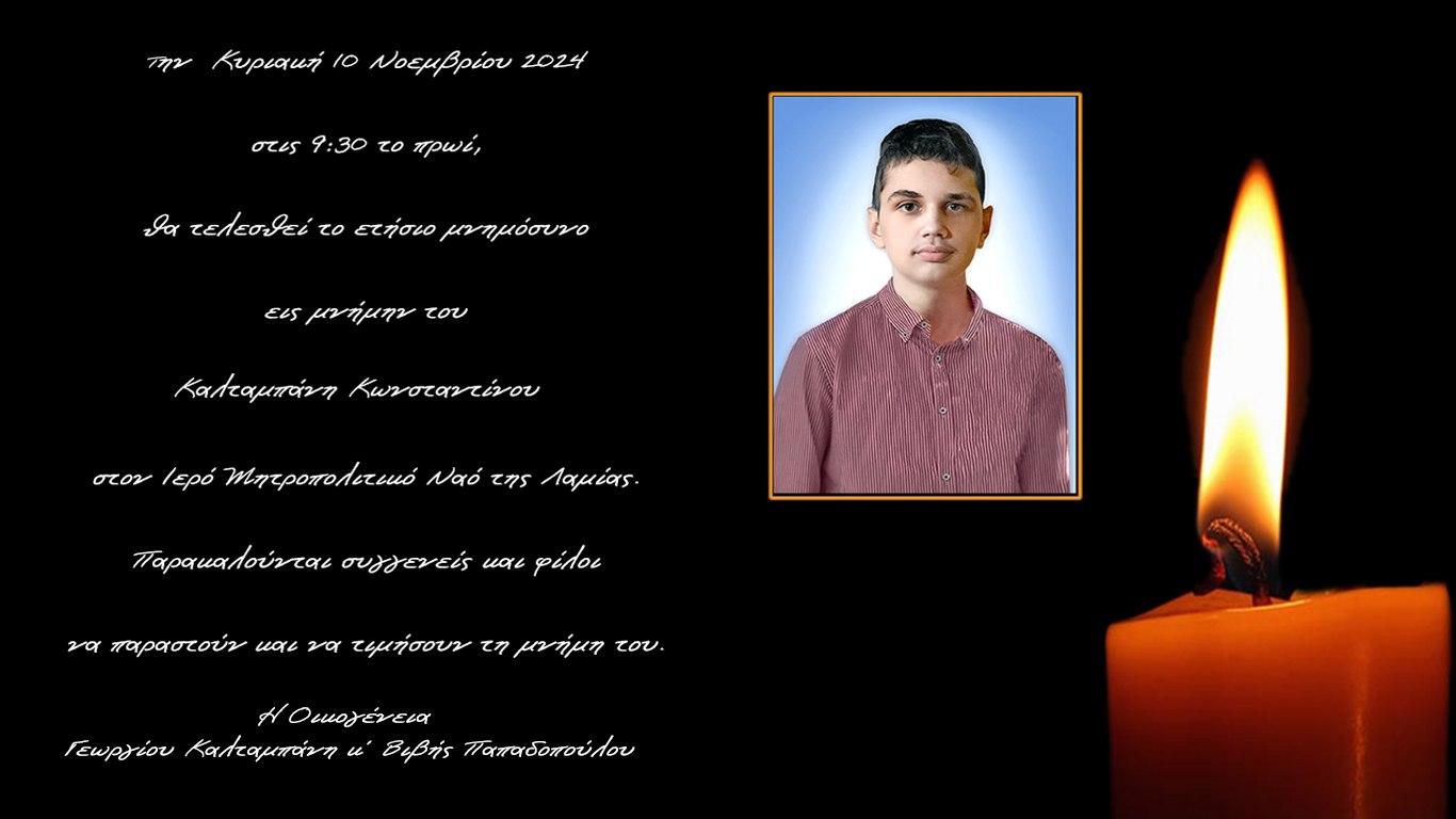 Την Κυριακή 10 Νοεμβρίου 2024 στις 9.30 π.μ. θα τελεσθεί το ετήσιο μνημόσυνο , εις μνήμην του Κωνσταντίνου Καλταμπάνη, στον Ιερό Μητροπολιτικό Ναό Ευαγγελισμού της Θεοτόκου Λαμίας.