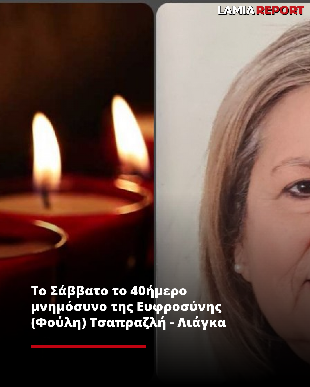 Το Σάββατο 1 Μαρτίου 2025 στις 09:00' το πρωί, θα τελεστεί το 40ήμερο μνημόσυνο της Ευφροσύνης (Φούλη) Τσαπραζλή - Λιάγκα, στον Ιερό Ναό Παναγίας Δέσποινας Λαμίας.
