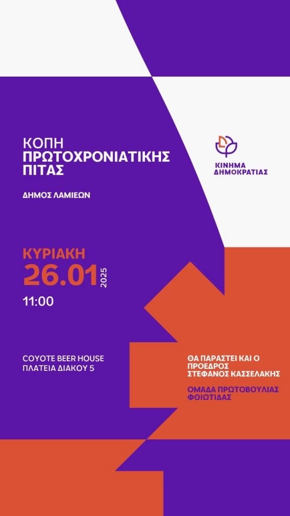 Ο κ. Κασσελάκης θα παραβρεθεί στην κοπή της Πρωτοχρονιάτικης πίτας που θα κόψει η Ομάδα Πρωτοβουλίας Φθιώτιδας του «Κινήματος Δημοκρατίας».