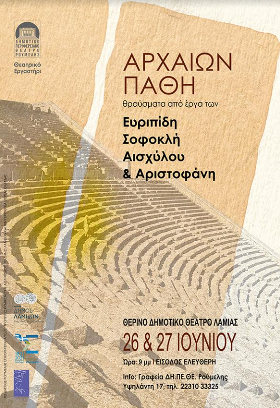 Το Θεατρικό Εργαστήρι του Δη.Πε.Θε. Ρούμελης, σας προσκαλεί στην παράσταση«Αρχαίων Πάθη»,τοΔευτέρα 26 και Τρίτη 27 Ιουνίου, στο Δημοτικό Θερινό Θέατρο Λαμίας, στις 21:00.