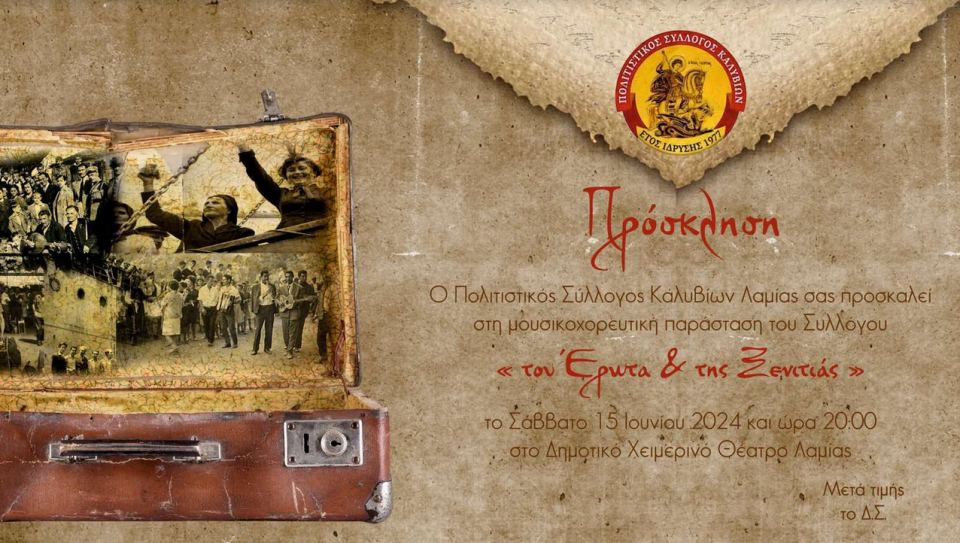 Ο Πολιτιστικός Σύλλογος Καλυβίων Λαμίας διοργανώνει την ετήσια μουσικοχορευτική παράσταση «Του Έρωτα και της Ξενιτιάς», εκεί που μικροί και μεγάλοι χορευτές θα χορέψουν και θα τραγουδήσουν τους πόθους και τις προσδοκίες του έρωτα καθώς και τις πίκρες της ξενιτιάς, μέσα από τις μουσικές της πλούσιας λαϊκής μας παράδοσης.