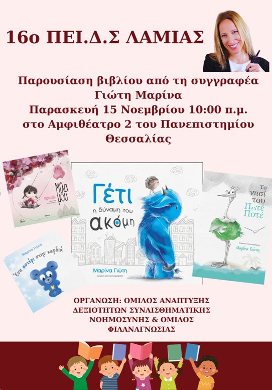 «Το σχολείο μας με χαρά ανακοινώνει εκδήλωση παρουσίασης βιβλίου, στο πλαίσιο των δράσεων του Ομίλου Ανάπτυξης Δεξιοτήτων Συναισθηματικής Νοημοσύνης και του Ομίλου Φιλαναγνωσίας. Η εκδήλωση θα πραγματοποιηθεί την Παρασκευή 15 Νοεμβρίου 2024 στις 10:00 π.μ. στην αίθουσα Αμφιθεάτρου 2 του Πανεπιστημίου Θεσσαλίας και έχουμε την τιμή να φιλοξενήσουμε τη βραβευμένη συγγραφέα, κ. Μαρίνα Γιώτη.