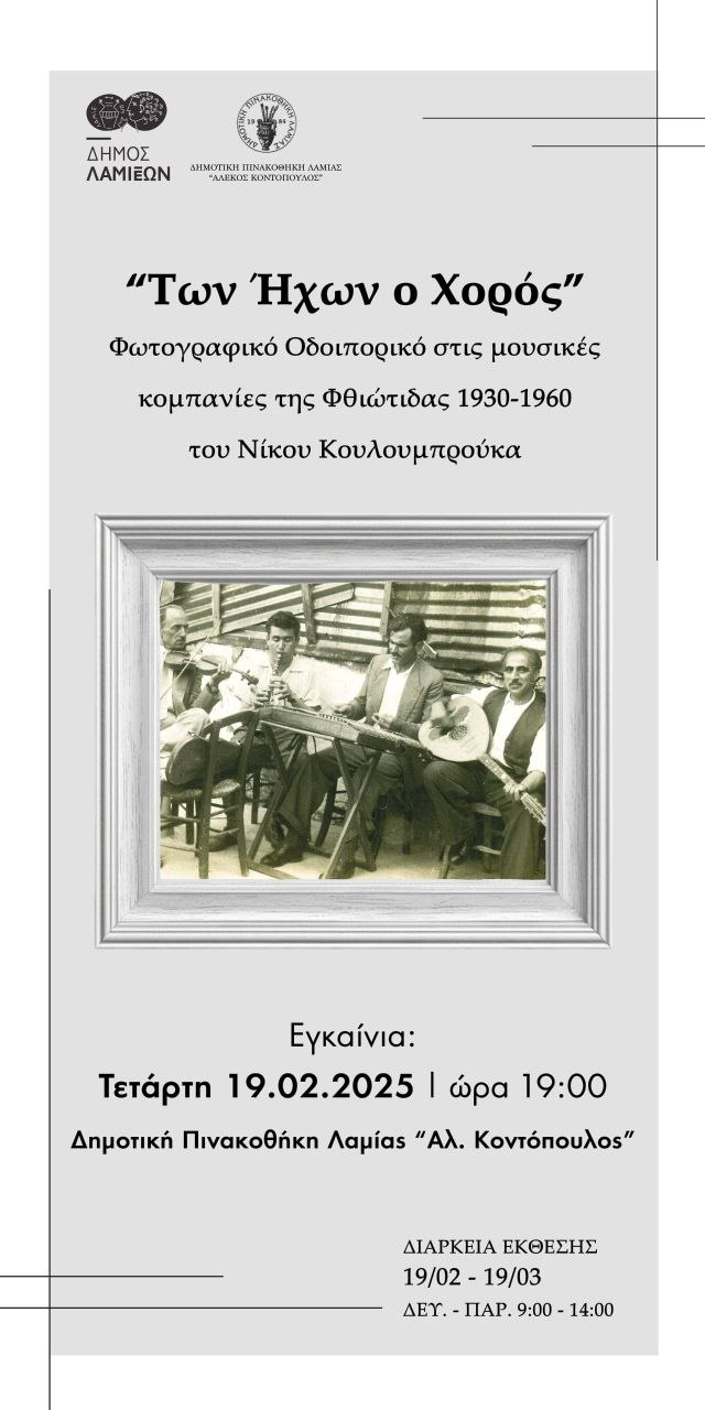 Ο Δήμος Λαμιέων και η Δημοτική Πινακοθήκη Λαμίας «Αλέκος Κοντόπουλος» εγκαινιάζουν την Εικαστική Έκθεση, με τίτλο: «Των Ήχων ο Χορός - Φωτογραφικό Οδοιπορικό στις μουσικές κομπανίες της Φθιώτιδας 1930 - 1960», την Τετάρτη 19 Φεβρουαρίου 2025 και ώρα 19.00.