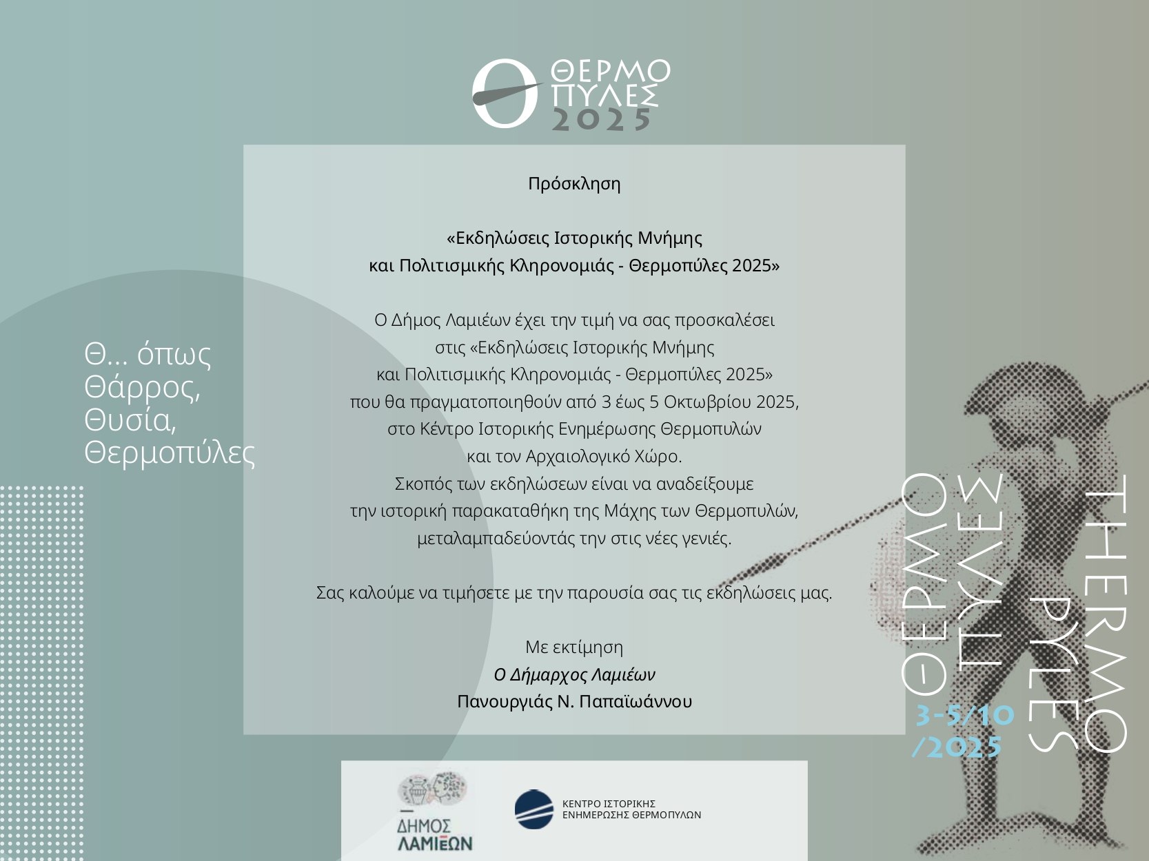 Ο Δήμος Λαμιέων σας προσκαλεί στις Εκδηλώσεις ιστορικής μνήμης και πολιτισμικής κληρονομιάς Θερμοπύλες 2025, για να τιμήσουμε το παρελθόν, να στοχαστούμε το παρόν και να δώσουμε χώρο στον πολιτισμό ως μέσο διαλόγου, μνήμης και συνέχειας.