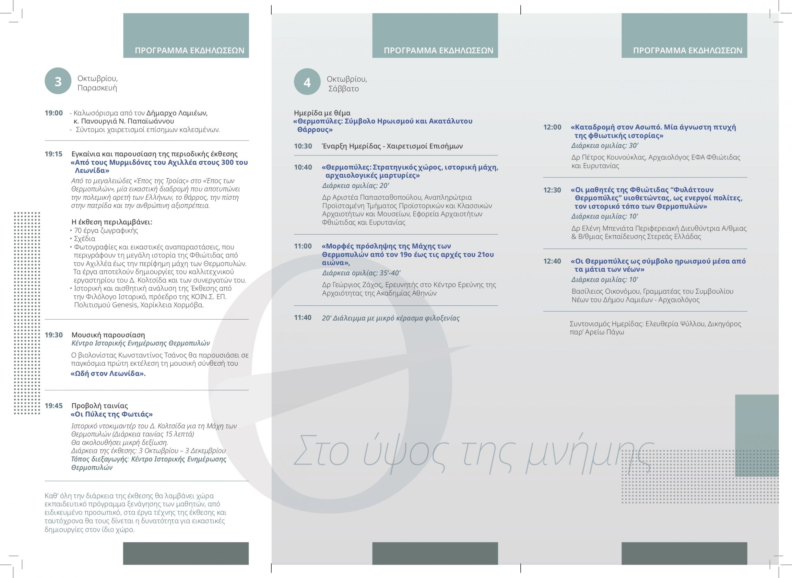 Οι εκδηλώσεις, που θα πραγματοποιηθούν για τρεις ημέρες στο Κέντρο Ιστορικής Ενημέρωσης Θερμοπυλών, περιλαμβάνουν ημερίδα με ενδιαφέρουσες ιστορικές ομιλίες από διακεκριμένους επιστήμονες, εικαστική έκθεση με θέμα «Από τους Μυρμιδόνες του Αχιλλέα στους 300 του Λεωνίδα», παρουσίαση σε παγκόσμια πρώτη εκτέλεση της μουσικής σύνθεσης του βιολονίστα Κωνσταντίνου Τσάνου «Ωδή στον Λεωνίδα» και προβολή του ιστορικού ντοκιμαντέρ του Δημήτρης Κολτσίδα για τη Μάχη των Θερμοπυλών αλλά και ξενάγηση στον αρχαιολογικό χώρο για το κοινό, στα Ελληνικά και στα Αγγλικά.