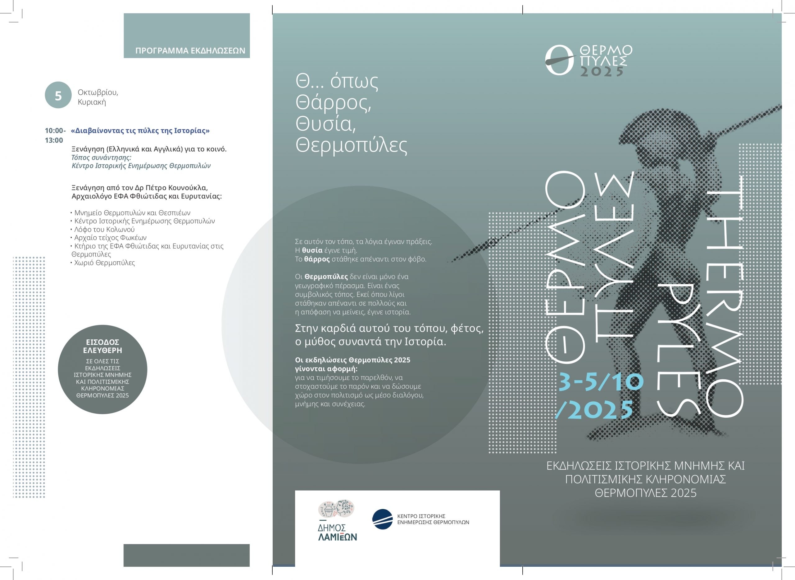 Ο Δήμος Λαμιέων διοργανώνει τις «Εκδηλώσεις ιστορικής μνήμης και πολιτισμικής κληρονομιάς Θερμοπύλες 2025» από τις 3 έως τις 5 Οκτωβρίου 2025, με στόχο να αναδείξουμε την ιστορική παρακαταθήκη της Μάχης των Θερμοπυλών, μεταλαμπαδεύοντάς την στις νέες γενιές.