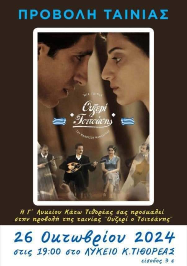 Την αρχή κάνουν οι μαθητές της Γ' Λυκείου Κάτω Τιθορέας με την προβολή της επίκαιρης ταινίας "Ουζερί ο Τσιτσάνης", στην αίθουσα εκδηλώσεων του Γυμνασίου - Λυκείου Κάτω Τιθορέας, το Σάββατο 26 Οκτωβρίου 2024 και ώρα 19:00. Σκοπός, η συγκέντρωση χρημάτων για την πενταήμερη εκδρομή τους. Ας ενισχύσουμε όλοι την προσπάθειά τους.