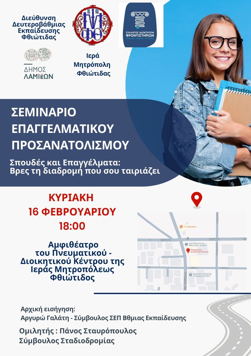 Ο Σύλλογος Ιδιοκτητών Φροντιστηρίων Φθιώτιδας – Φωκίδας - Ευρυτανίας σε συνεργασία με τον δήμο Λαμιέων, την Ιερά Μητρόπολη Φθιώτιδας και τη διεύθυνση Δευτεροβάθμιας Εκπαίδευσης Φθιώτιδας, διοργανώνουν την Κυριακή 16 Φεβρουαρίου, στις 18:00, στο Αμφιθέατρο του Πνευματικού Διοικητικού Κέντρου Ιεράς Μητροπόλεως Φθιώτιδας, σεμινάριο επαγγελματικού προσανατολισμού με θέμα «Σπουδές και Επαγγέλματα: Βρες τη διαδρομή που σου ταιριάζει».