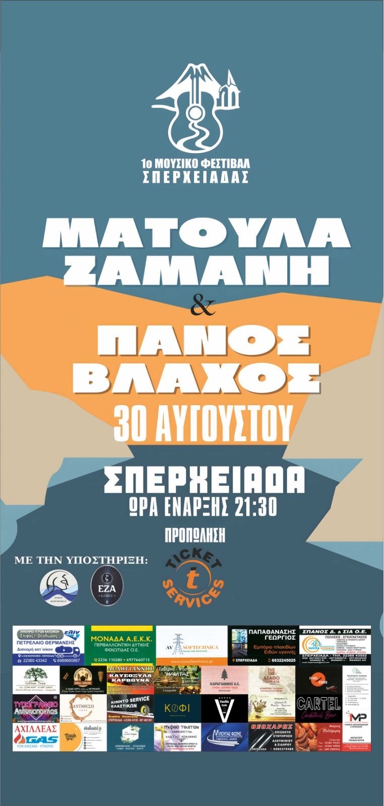 Ο Σύλλογος Νέων Σπερχειάδας διοργανώνει το 1ο Μουσικό Φεστιβάλ Σπερχειάδας, στο πλαίσιο του οποίου θα φιλοξενηθούν η Ματούλα Ζαμάνη και ο Πάνος Βλάχος.