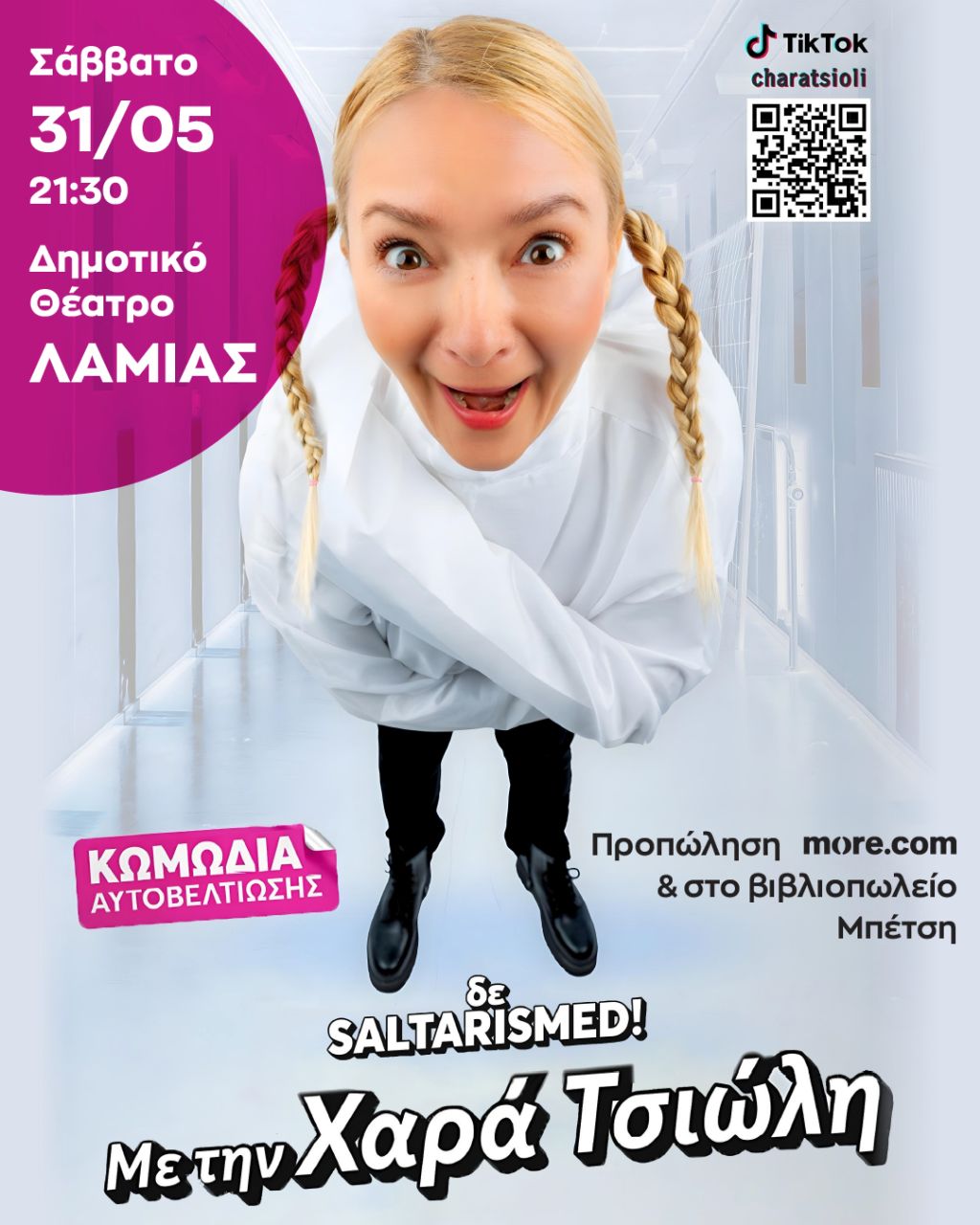Είσαι σαλταρισμένος; Αποτυχημένος; Κακόκεφος; Μίζερος; Απένταρος; Είσαι βουτηγμένος στη μετριότητα και δεν έχεις καταφέρει ως τώρα στη ζωή σου να ξεχωρίσεις και να διακριθείς; Μην ανησυχείς! Η laugh coach Χαρά Τσιώλη, φέρνει για πρώτη φορά στην Λαμία την πρώτη κωμωδία αυτοβελτίωσης παγκοσμίως, με τον τίτλο "δε Saltarismed" για μια και μοναδική παράσταση στις 31 Μαΐου 2025 στο Δημοτικό Θέατρο Λαμίας στις 21.30.