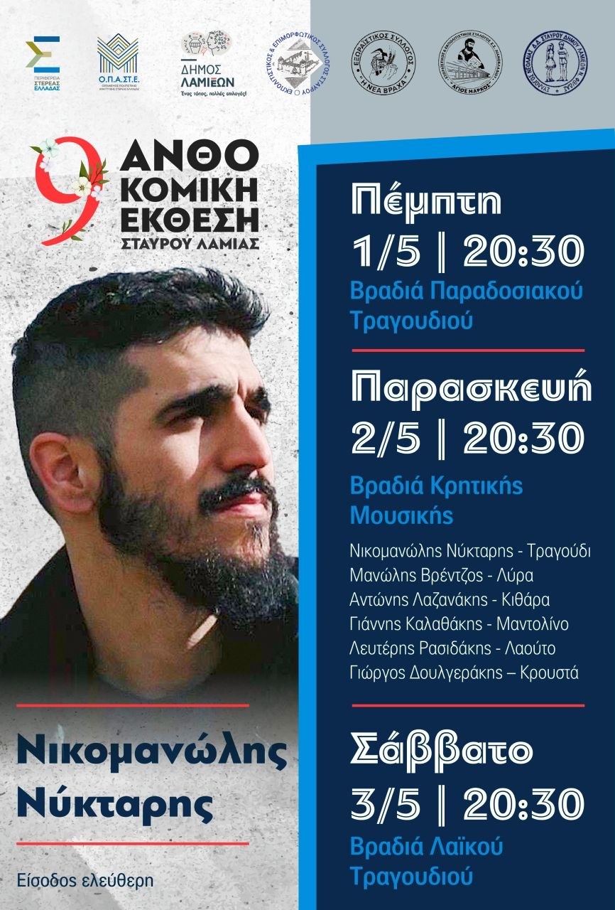Ο γνωστός Κρητικός τραγουδιστής Νικομανώλης Νύκταρης με την ορχήστρα του θα προσφέρουν στο κοινό μοναδικές παραδοσιακές Κρητικές μελωδίες, μεταφέροντας τη μαγεία της Κρήτης στη Λαμία.