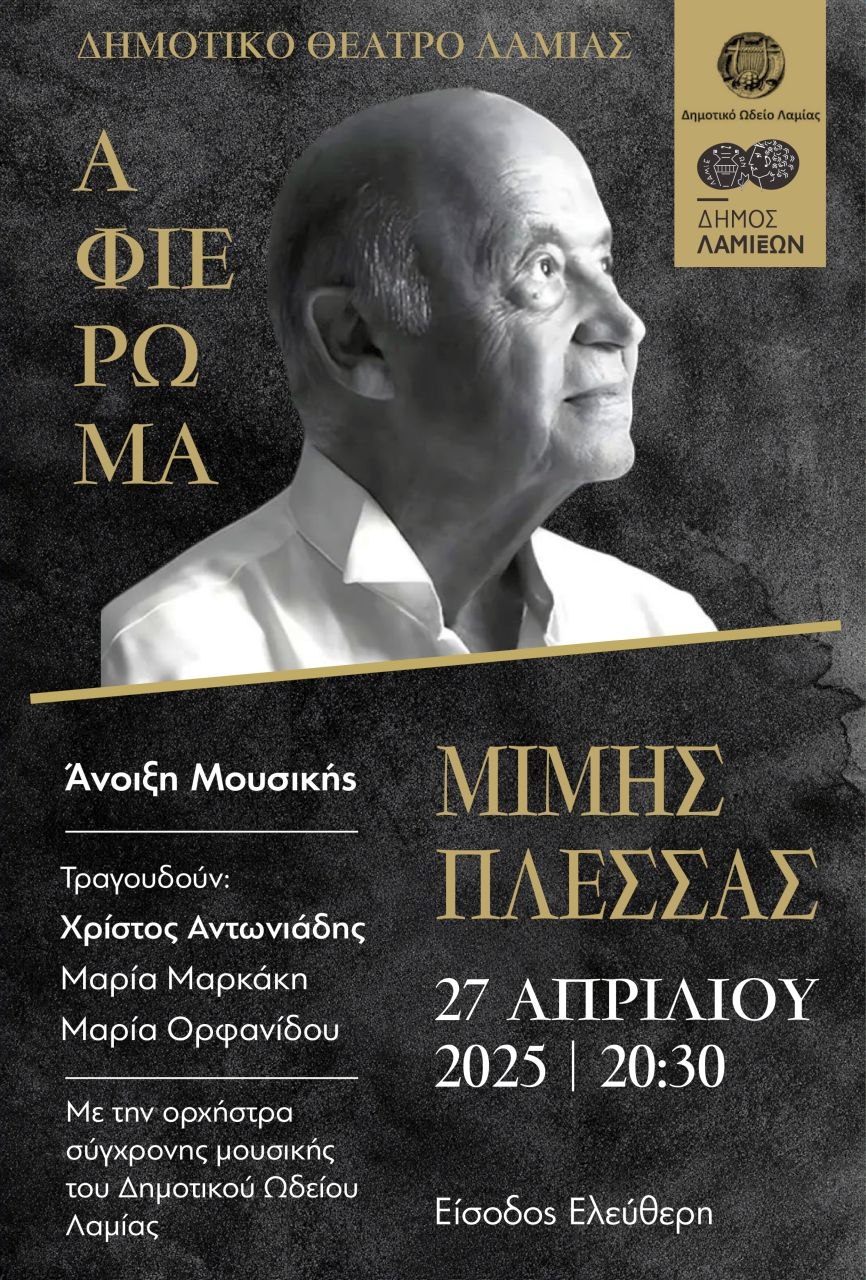 Το Δημοτικό Ωδείο Λαμίας, στο πλαίσιο της Άνοιξης Μουσικής στην πόλη 2025, διοργανώνει αφιέρωμα στο μουσικοσυνθέτη Μίμη Πλέσσα, την Κυριακή 27 Απριλίου και ώρα 20:30 στο Δημοτικό Θέατρο Λαμίας.