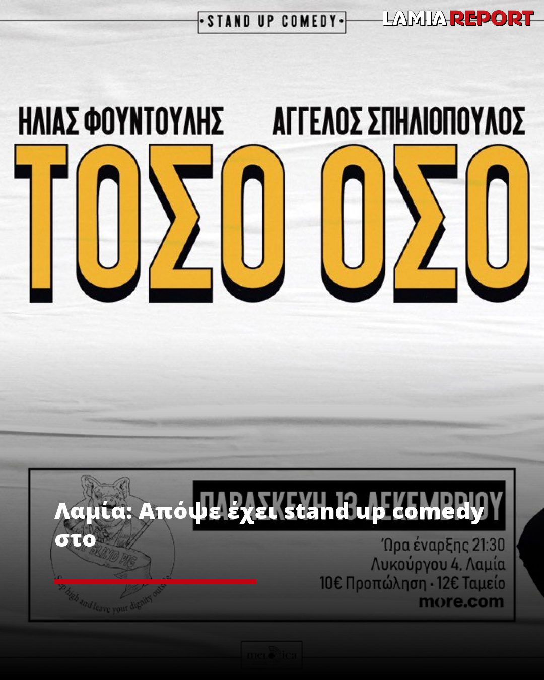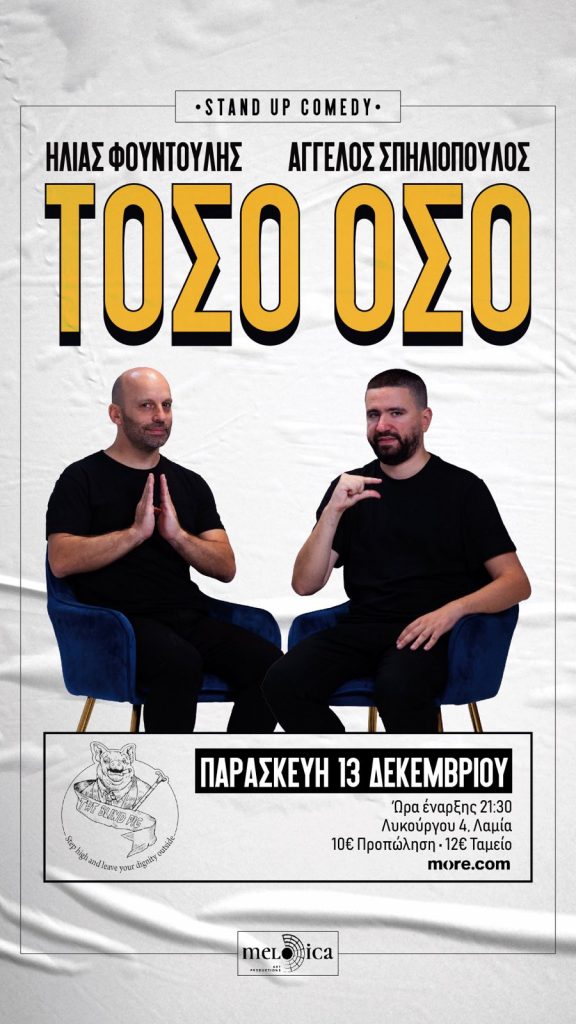 Σήμερα, Παρασκευή 13 Δεκεμβρίου στις 21:30, ο Ηλίας Φουντούλης και ο Άγγελος Σπηλιόπουλος σε μία παράσταση που θα έχει διάφορα να μας πει...Τόσο Όσο!