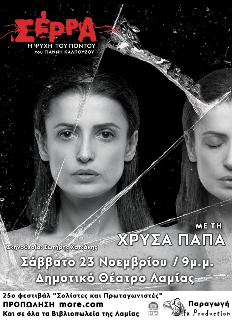 Η παράσταση "Σέρρα-Η ψυχή του Πόντου", βασισμένη στο ομώνυμο μυθιστόρημα του Γιάννη Καλπούζου, με την εξαιρετική ερμηνεία της Χρύσας Παπά, συνεχίζει για τρίτη χρονιά και ξεκίνησε την Πανελλαδική και Ευρωπαϊκή της περιοδεία, κάνοντας μια στάση στη Λαμία.
