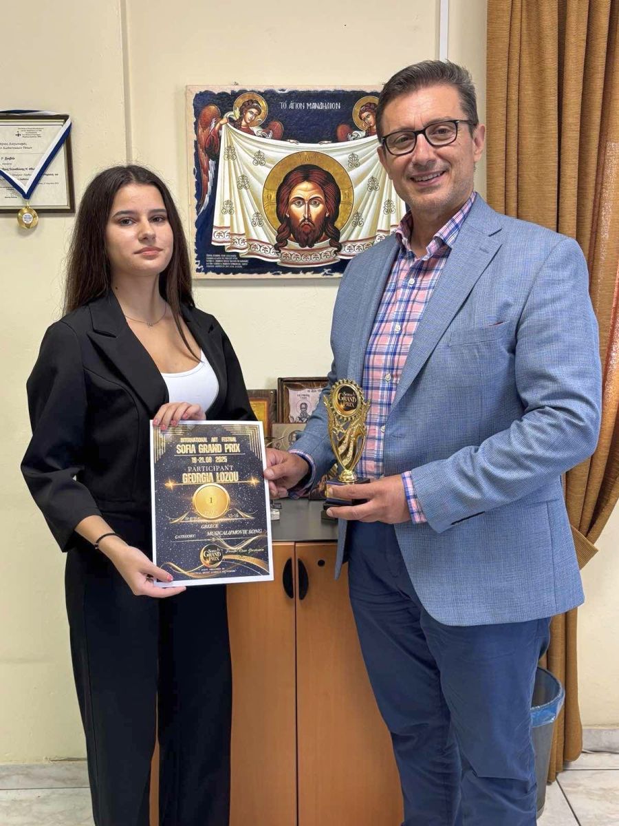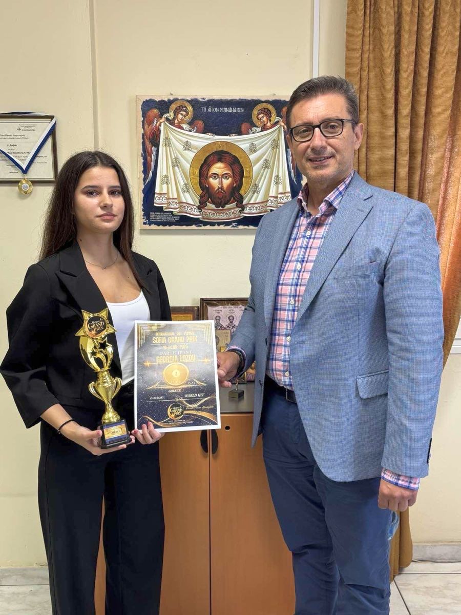 Σε μια ιδιαίτερα συγκινητική και λαμπρή τελετή που πραγματοποιήθηκε το μεσημέρι της Τρίτης, 1 Οκτωβρίου 2025, η μαθήτρια Λόζου Γεωργία τιμήθηκε για την κορυφαία διεθνή της διάκριση, κατακτώντας την πρώτη θέση και δύο χρυσά μετάλλια στον Διεθνή Διαγωνισμό Τραγουδιού “Sofia Grand Prix”, που έλαβε χώρα στη Σόφια της Βουλγαρίας.