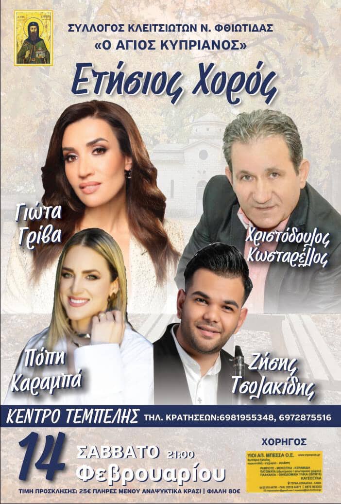 Η ετήσια χοροεσπερίδα του του Συλλόγου Κλειτσιωτών Ν. Φθιώτιδας "Ο Άγιος Κυπριανός" θα έχει ζωντανή ορχήστρα.