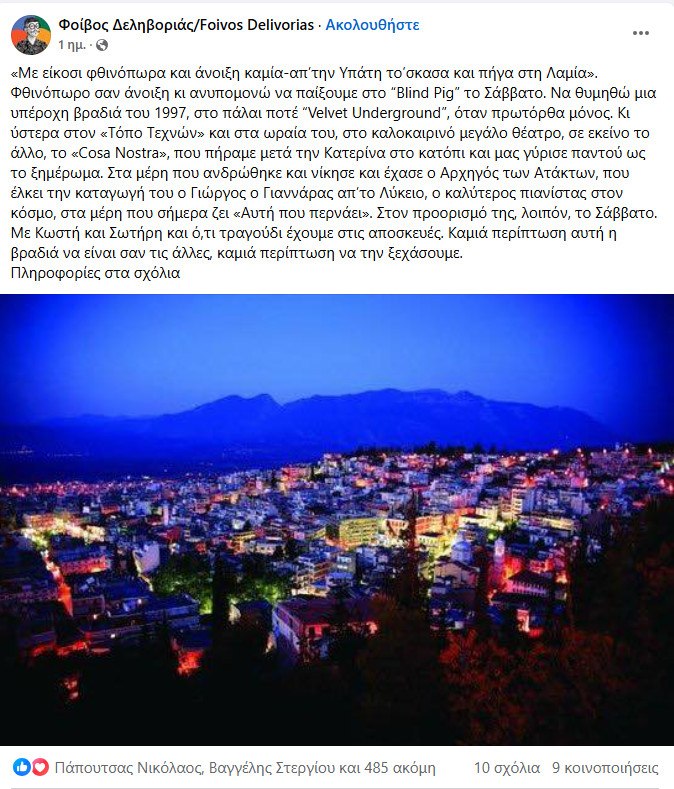«Με είκοσι φθινόπωρα και άνοιξη καμία-απ’την Υπάτη το’σκασα και πήγα στη Λαμία», γράφει ο Φοίβος Δεληβοριάς στην ανάρτησή του για την αποψινή εμφάνιση στη Λαμία, με όμορφες θύμησες από τις περασμένες εμφανίσεις του στην περιοχή μας.