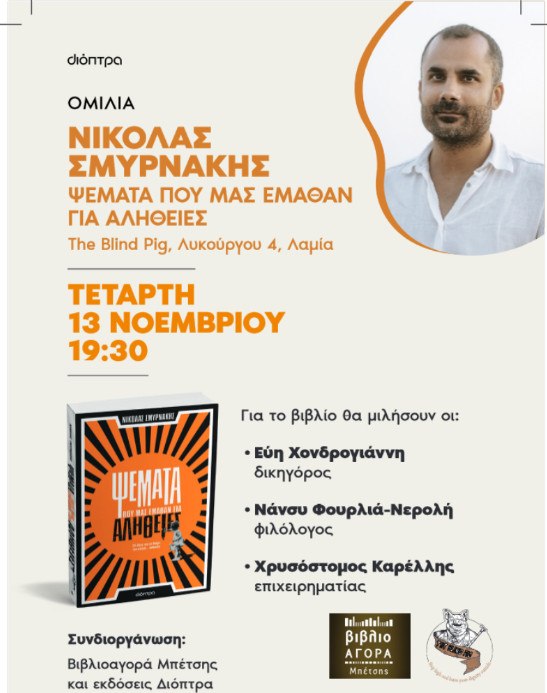 Ο Νικόλας Σμυρνάκης σήμερα στη Λαμία για την παρουσίαση του νέου του βιβλίου