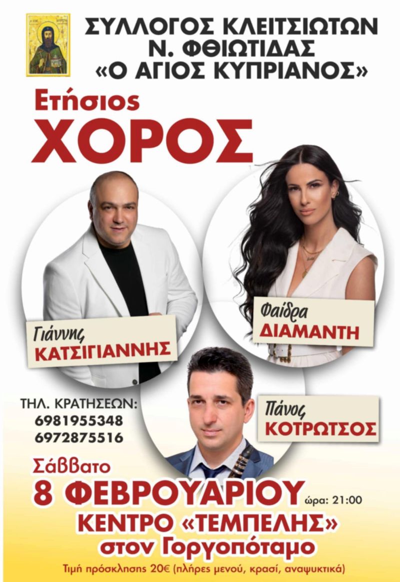 Ο Σύλλογος Κλειτσιωτών Ν. Φθιώτιδας «Ο Άγιος Κυπριανός» διοργανώνει την ετήσια χοροεσπερίδα του το Σάββατο 8 Φεβρουαρίου 2025.