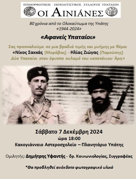 Ο Εκπολιτιστικός - Επιμορφωτικός Σύλλογος Υπαταίων «Οι Αινιάνες» σας προσκαλεί να συμμετάσχετε το Σάββατο 7 Δεκεμβρίου και ώρα 18:00 στο Κακογιάννειο Αστεροσχολείο Υπάτης σε μια βραδιά τιμής και μνήμης με θέμα: «Αφανείς Υπαταίοι, Νίκος Σακκάς (Μοράβας) - Ηλίας Ζιώγας (Παρούσης) δύο Υπαταίοι στον έφιππο ουλαμό του καπετάνιου Άρη».