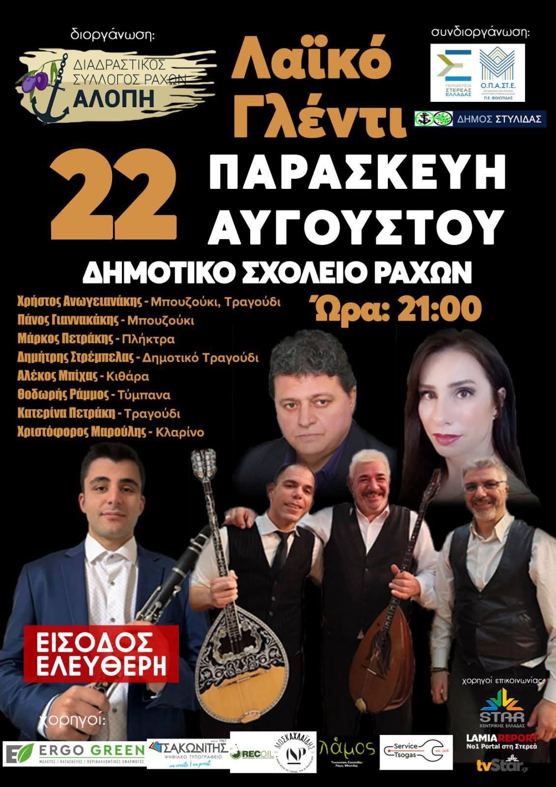 Ο Αύγουστος στις Ράχες κλείνει παραδοσιακά με μουσική και χορό, καθώς ο Διαδραστικός Σύλλογος Ραχών «Αλόπη», σε συνδιοργάνωση με την Περιφέρεια Στερεάς Ελλάδας, τον Ο.Π.Α.Σ.Τ.Ε. και τον Δήμο Στυλίδας, διοργανώνει ένα μεγάλο καλοκαιρινό λαϊκό γλέντι.