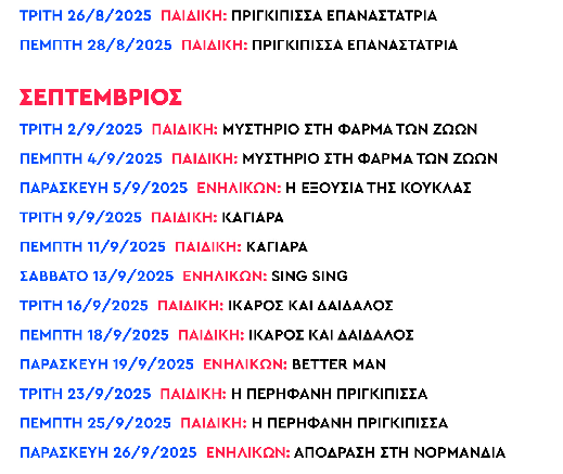 Δείτε το πλήρες πρόγραμμα προβολών για τον υπόλοιπο Αύγουστο και Σεπτέμβριο.