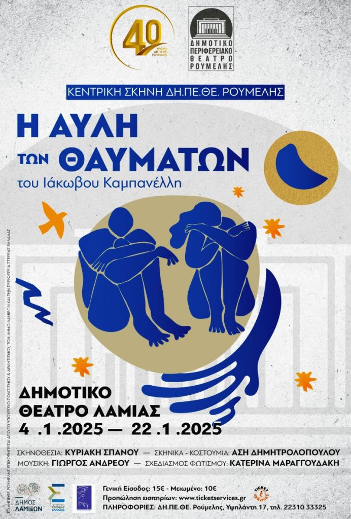 Το ΔΗ.ΠΕ.ΘΕ Ρούμελης γιορτάζει 40 χρόνια λειτουργίας και η κεντρική του σκηνή για την θεατρική περίοδο 2024 – 2025 κάνει πρεμιέρα, αύριο Σάββατο 4 Ιανουαρίου 2025, στις 9:00' το βράδυ, με την «Αυλή των Θαυμάτων» του Ιάκωβου Καμπανέλλη.