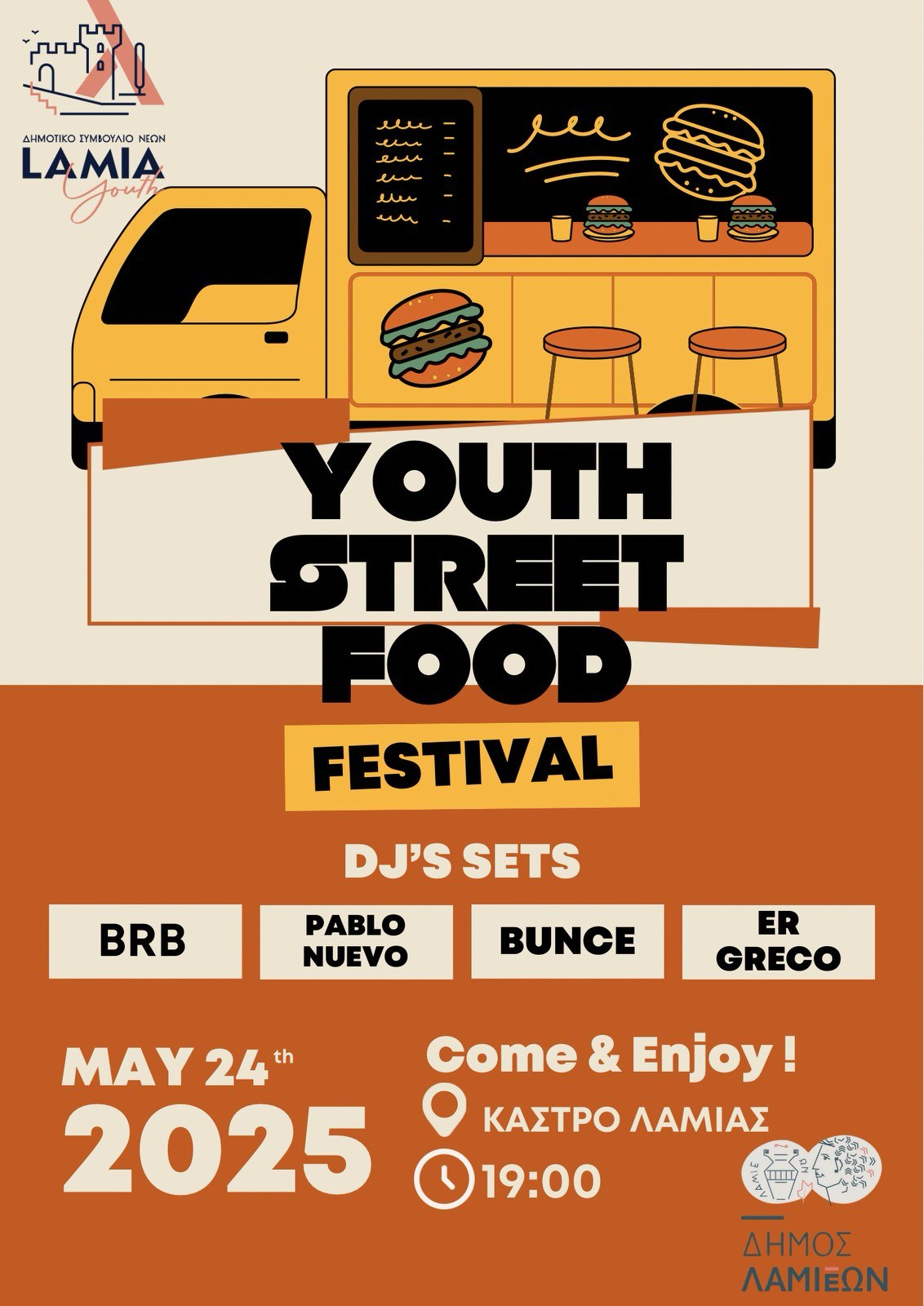 Το Συμβούλιο Νέων του Δήμου Λαμιέων διοργανώνει το 1ο Youth Street Food Festival, το Σάββατο 24 Μαΐου 2025 και ώρα 19:00, στον μαγευτικό χώρο νότια του Κάστρου της Λαμίας, επί της οδού Μελίνας Μερκούρη.