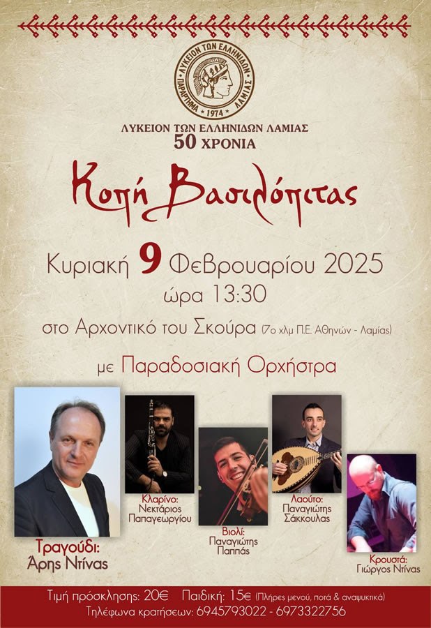Το Λύκειο των Ελληνίδων Λαμίας, που φέτος συμπληρώνει 50 χρόνια λειτουργίας, θα κόψει την πρωτοχρονιάτικη πίτα του, την Κυριακή 9 Φεβρουαρίου 2025.