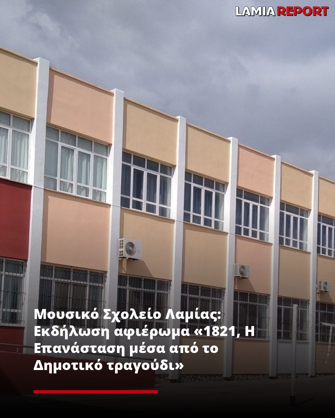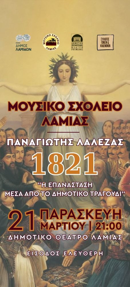 Το Μουσικό Σχολείο Λαμίας σε συνεργασία με το ΔΗ.ΠΕ.ΘΕ Ρούμελης και τον Σύλλογο Γονέων και Κηδεμόνων διοργανώνουν – υπό την αιγίδα του Δήμου Λαμιέων – την εκδήλωση αφιέρωμα : «1821, Η ΕΠΑΝΑΣΤΑΣΗ ΜΕΣΑ ΑΠΟ ΤΟ ΔΗΜΟΤΙΚΟ ΤΡΑΓΟΥΔΙ» με τον Παναγιώτη Λάλεζα, την Παρασκευή, 21 Μαρτίου 2025 και ώρα 21.00, στο Δημοτικό Θέατρο Λαμίας.