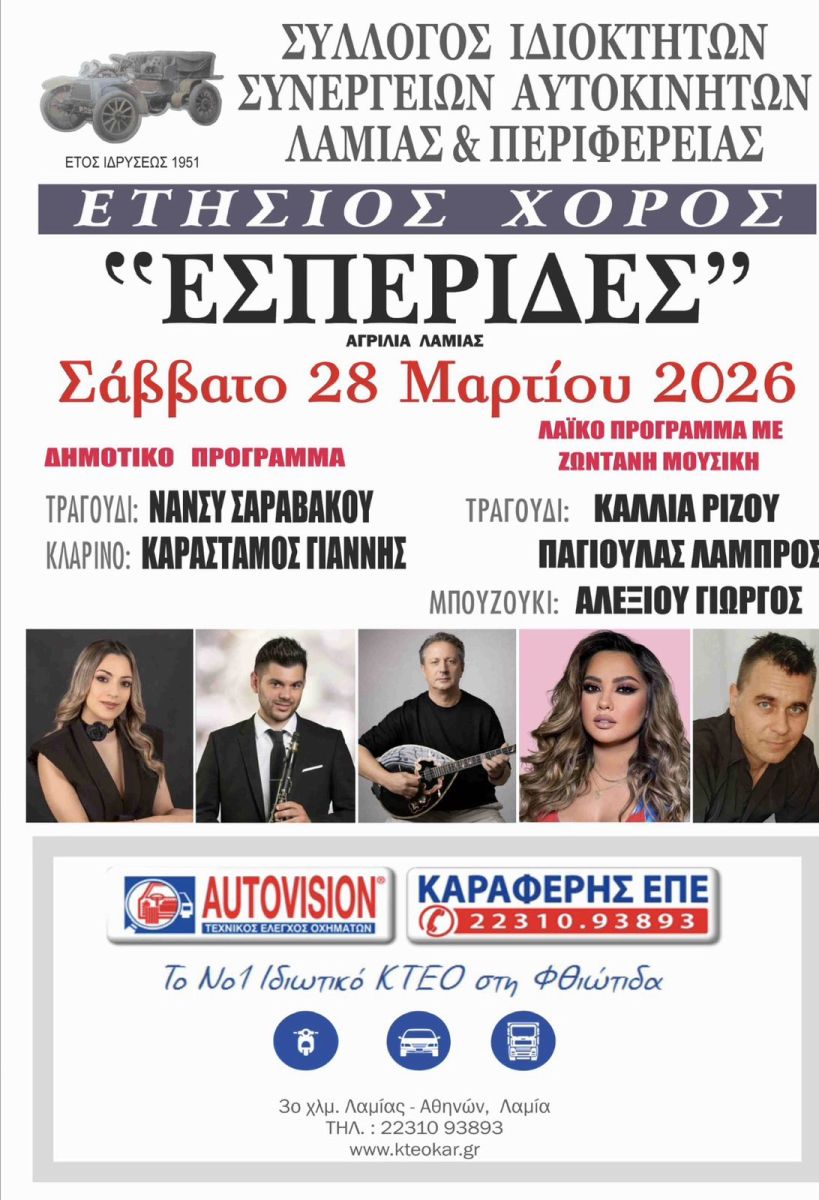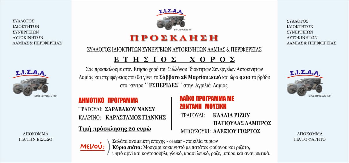 Ο Σύλλογος Ιδιοκτητών Συνεργείων Αυτοκινήτων Λαμίας και Περιφέρειας διοργανώνει και φέτος τον ετήσιο χορό του.