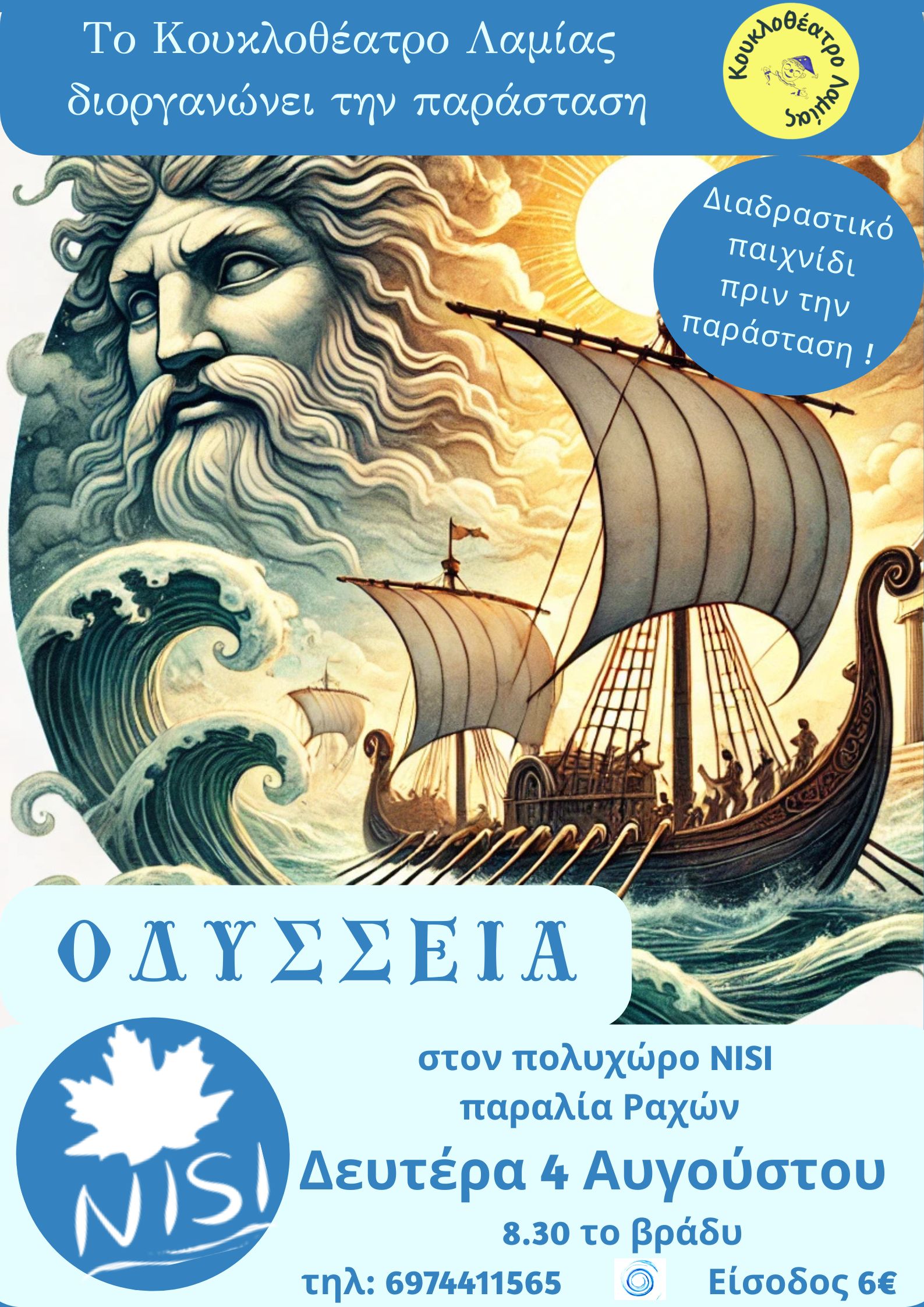 Το Κουκλοθέατρο Λαμίας διοργανώνει μια μοναδική παράσταση με τίτλο «ΟΔΥΣΣΕΙΑ», βασισμένη στο ομηρικό έπος, στον υπέροχο πολυχώρο NISI στην παραλία Ραχών, τη Δευτέρα 4 Αυγούστου και ώρα 8:30 το βράδυ.