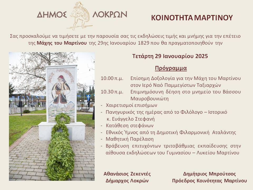 Την Τετάρτη (29/1/2025) ,η Κοινότητα Μαρτίνου με τη στήριξη του δήμου Λοκρών, σας προσκαλεί σε μια σειρά εκδηλώσεων τιμής και μνήμης για την επέτειο της «Μάχης του Μαρτίνου της 29ης Ιανουαρίου 1829», στο Μαρτίνο του Δήμου Λοκρών .