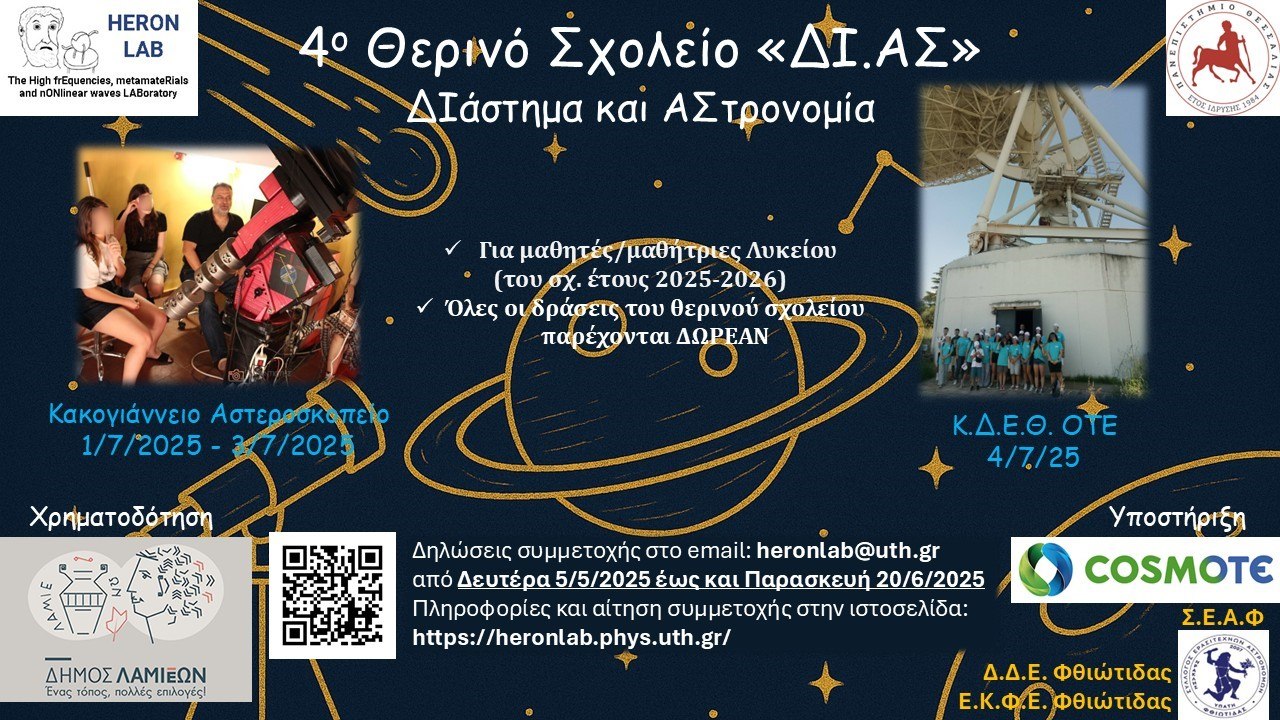 Το 4ο Θερινό Σχολείο «ΔΙ.ΑΣ» διοργανώνεται από το ερευνητικό εργαστήριο HERON LAB του Τμήματος Φυσικής του Πανεπιστημίου Θεσσαλίας και το Δήμο Λαμιέων, με την υποστήριξη της Διεύθυνσης Δευτεροβάθμιας Εκπαίδευσης Φθιώτιδας και του Ε.Κ.Φ.Ε. Φθιώτιδας. Θα πραγματοποιηθεί από 1 έως 4 Ιουλίου 2025 στη γραφική Υπάτη και στο Κέντρο Δορυφορικών Επικοινωνιών «Θερμοπύλαι» στη Σκάρφεια.