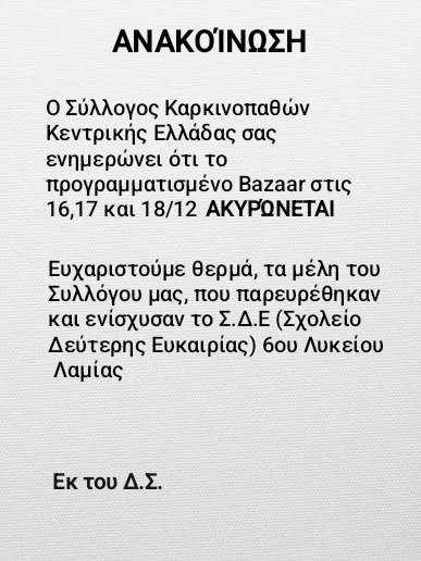 Ο Σύλλογος Καρκινοπαθών Κεντρικής Ελλάδας ενημερώνει ότι ακυρώνεται το προγραμματισμένο bazaar στις 16,17 και 18/12.