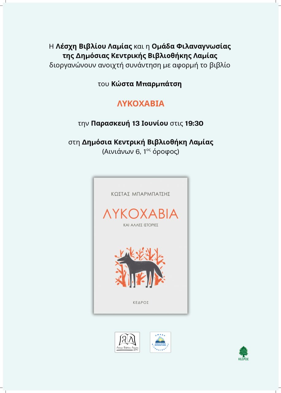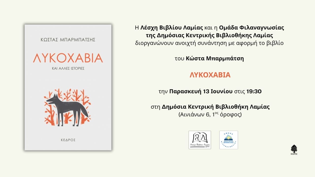 Η Λέσχη Βιβλίου Λαμίας και η Ομάδα Φιλαναγνωσίας της Δημόσιας Κεντρικής Βιβλιοθήκης Λαμίας σας προσκαλούν σε μια ξεχωριστή κοινή συνάντηση με αφορμή το βιβλίο του συγγραφέα Κώστα Μπαρμπάτση με τίτλο «Λυκοχαβιά και άλλες ιστορίες» (εκδόσεις Κέδρος).