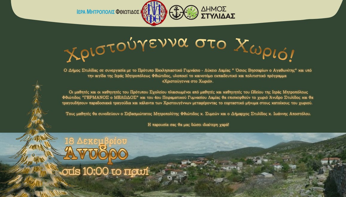 Ο Δήμος Στυλίδας σε συνεργασία, την Πέμπτη 18 Δεκεμβρίου στις 10 το πρωί με το Πρότυπο-Εκκλησιαστικό Γυμνάσιο-Λύκειο Λαμίας ''Όσιος Βησσαρίων ο Αγαθωνίτης'' και υπό την αιγίδα της Ιεράς Μητροπόλεως Φθιώτιδος, υλοποιεί το καινοτόμο εκπαιδευτικό και πολιτιστικό πρόγραμμα «Χριστούγεννα στο χωριό».