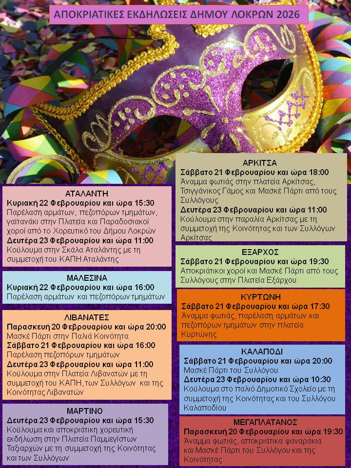 Από την Παρασκευή 20 Φεβρουαρίου μέχρι και την Καθαρά Δευτέρα 23 Φεβρουαρίου, ο Δήμος Λοκρών μαζί με τις Κοινότητες έχουν ετοιμάσει ένα πλούσιο εορταστικό πρόγραμμα.