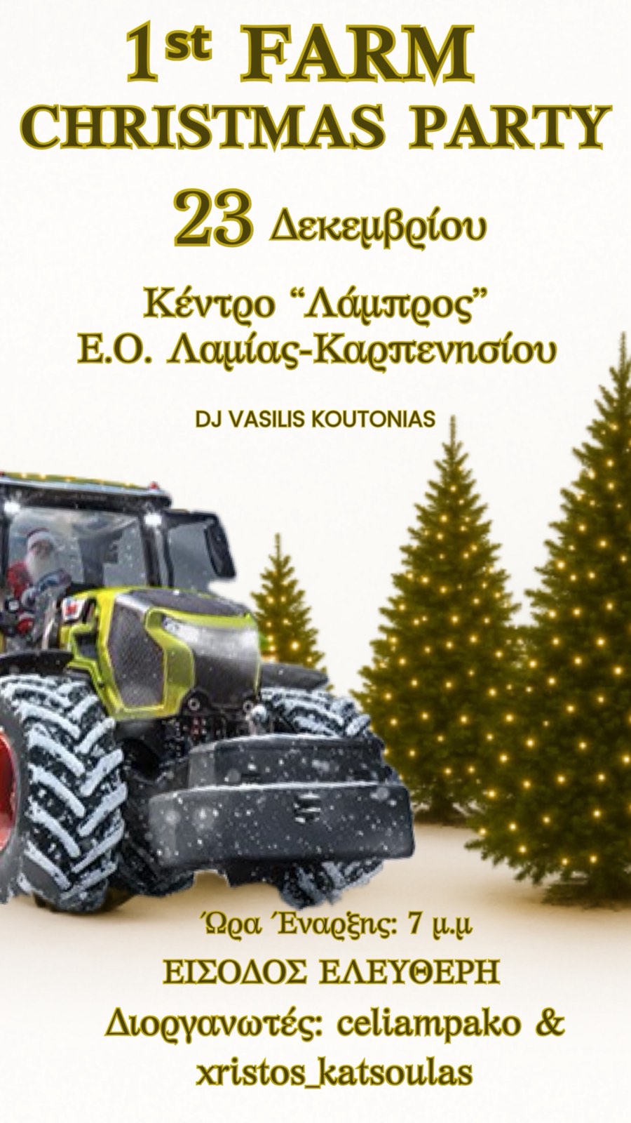 Τώρα η Σύλια Μπακοστέργιου (celiampako) και ο Χρήστος Κατσούλας (xristos_katsoulas) μας προσκαλούν στο 1ο Αγροτικό Χριστουγεννιάτικο Πάρτυ που συνδιοργανώνουν απόψε (23/12) στις 7 μμ στο Κέντρο «Λάμπρος» στην εθνική οδό Λαμίας - Καρπενησίου, με ελεύθερη είσοδο.