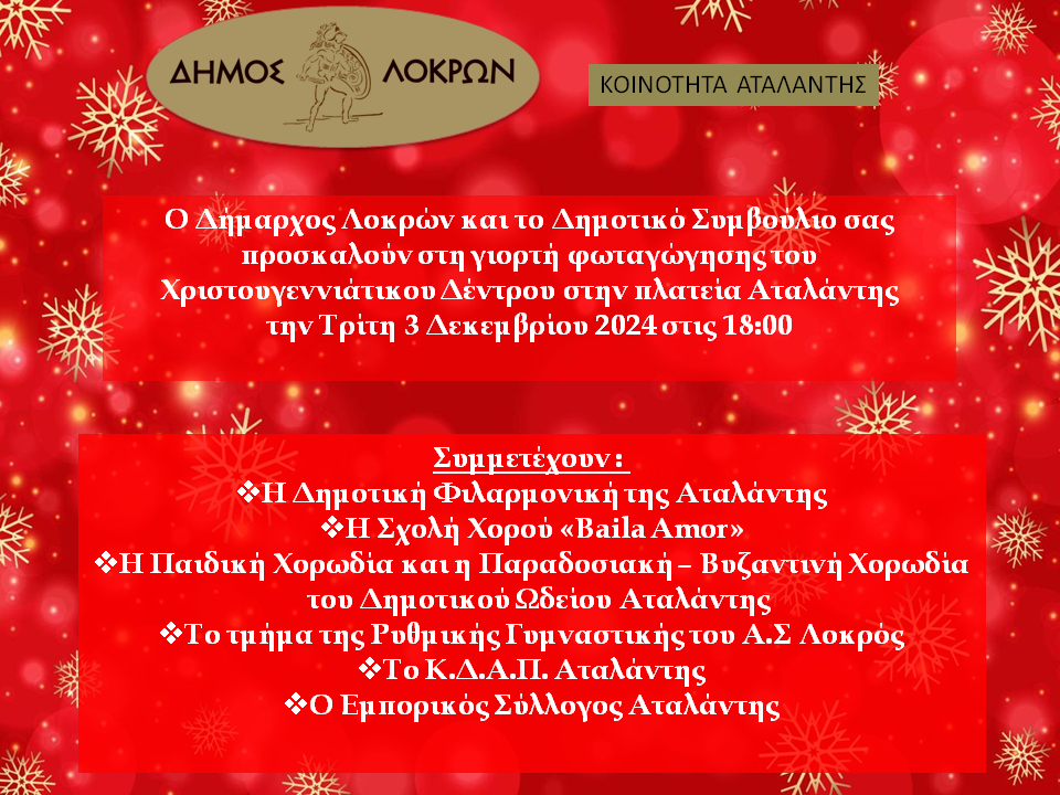Ο Δήμαρχος Λοκρών και το Δημοτικό Συμβούλιο μας προσκαλούν στη γιορτή φωταγώγησης του Χριστουγεωιάτικου Δέντρου στην πλατεία Αταλάντης την Τρίτη 3 Δεκεμβρίου 2024 στις 18:00’