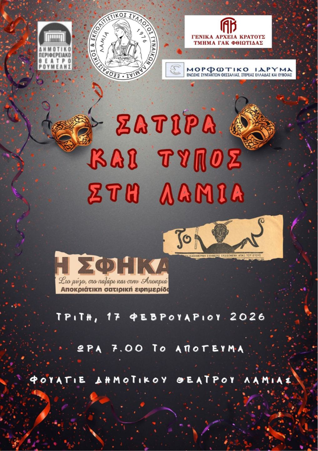 Ο Εξωραϊστικός και Εκπολιτιστικός Σύλλογος Γυναικών Λαμίας, τα Γενικά Αρχεία του Κράτους Φθιώτιδας, το ΔΗ.ΠΕ.ΘΕ. Ρούμελης και το Μορφωτικό Ίδρυμα Ενώσεως Θεσσαλίας - Στερεάς Ελλάδας - Εύβοιας σας προσκαλούν σε μια ξεχωριστή εκδήλωση με τίτλο «Σάτυρα και Τύπος στη Λαμία».