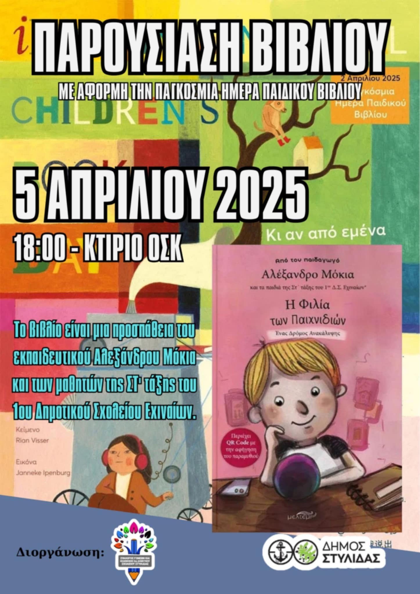 Ο Σύλλογος Γονέων και Κηδεμόνων του 2ου Δημοτικού Σχολείου Στυλίδας, σε συνεργασία με το 1ο Δημοτικό Σχολείο Εχιναίων σας προσκαλούν σε μια ξεχωριστή εκδήλωση παρουσίασης βιβλίου, αφιερωμένη στους μικρούς και μεγάλους φίλους της λογοτεχνίας στο ΟΣΚ Στυλίδας.