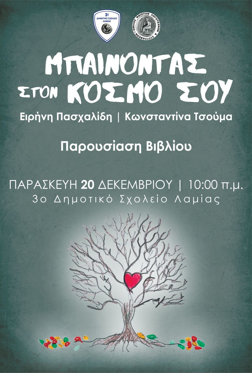 Το 3ο Δημοτικό Σχολείο Λαμίας μαζί με τον Όμιλο Φθιωτών Λογοτεχνών και Συγγραφέων παρουσιάζουν το παραμύθι της Ειρήνης Πασχαλίδη και Κωνσταντίνας Τσούμα «ΜΠΑΙΝΟΝΤΑΣ ΣΤΟΝ ΚΟΣΜΟ ΣΟΥ» εικονογραφημένο με τις ζωγραφιές των μαθητών της Στ΄ τάξης του σχολείου.