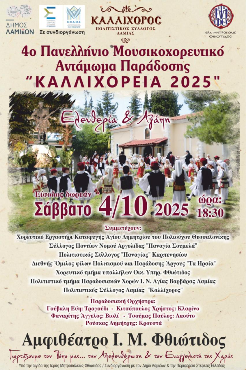 Για 4η συνεχόμενη χρονιά ο πολιτιστικός σύλλογος Καλλίχορος Λαμίας διοργανώνει το Πανελλήνιο Μουσικοχορευτικό Αντάμωμα Παράδοσης “Καλλιχόρεια 2025”.