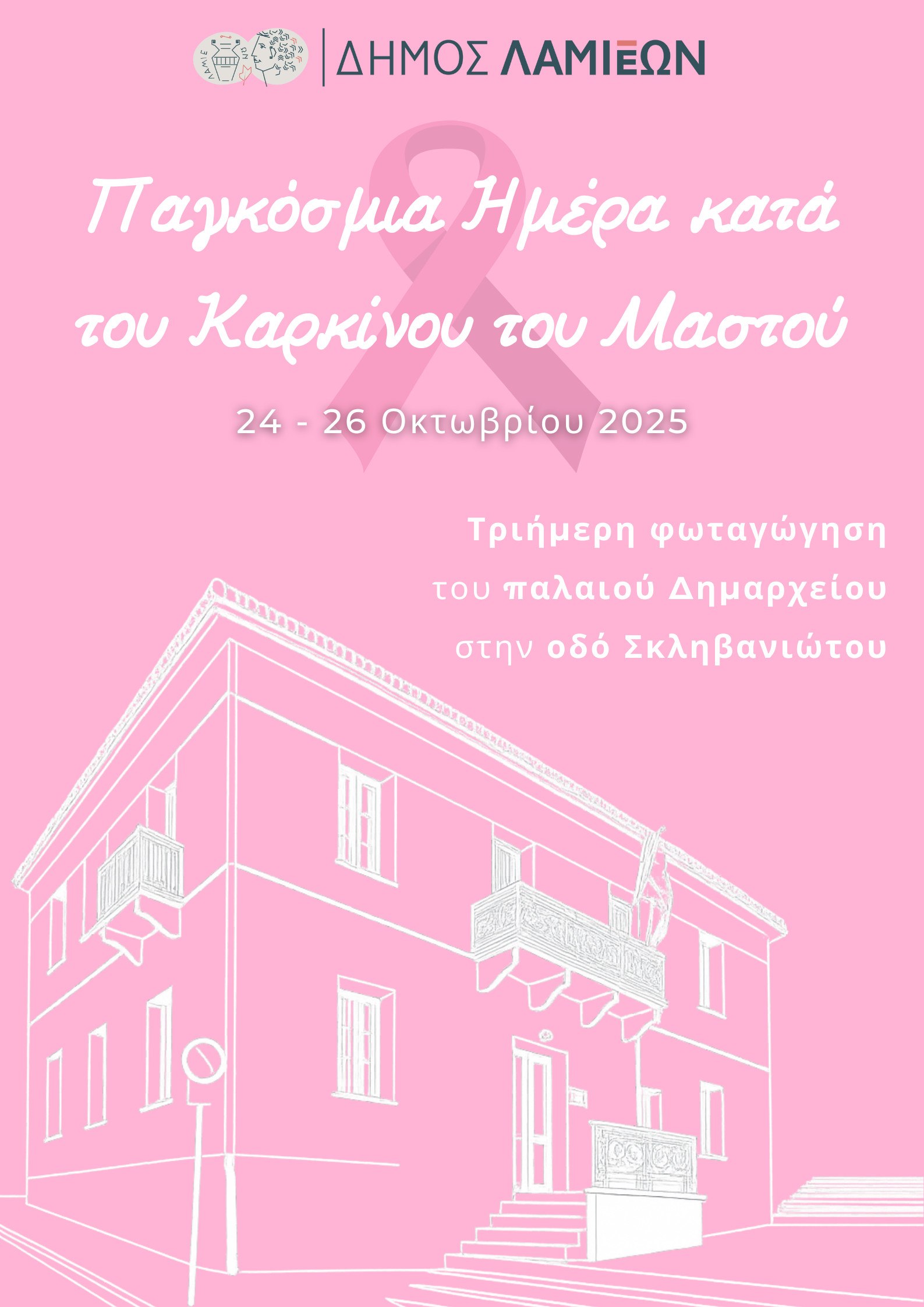 Ο Δήμος Λαμιέων συμμετέχει ενεργά στις δράσεις ενημέρωσης και ευαισθητοποίησης, που πραγματοποιούνται σε όλο τον κόσμο, προχωρώντας στη φωταγώγηση του παλαιού Δημαρχείου, στην οδό Σκληβανιώτου σε ροζ χρώμα, από την Παρασκευή 24 έως και την Κυριακή 26 Οκτωβρίου 2025.