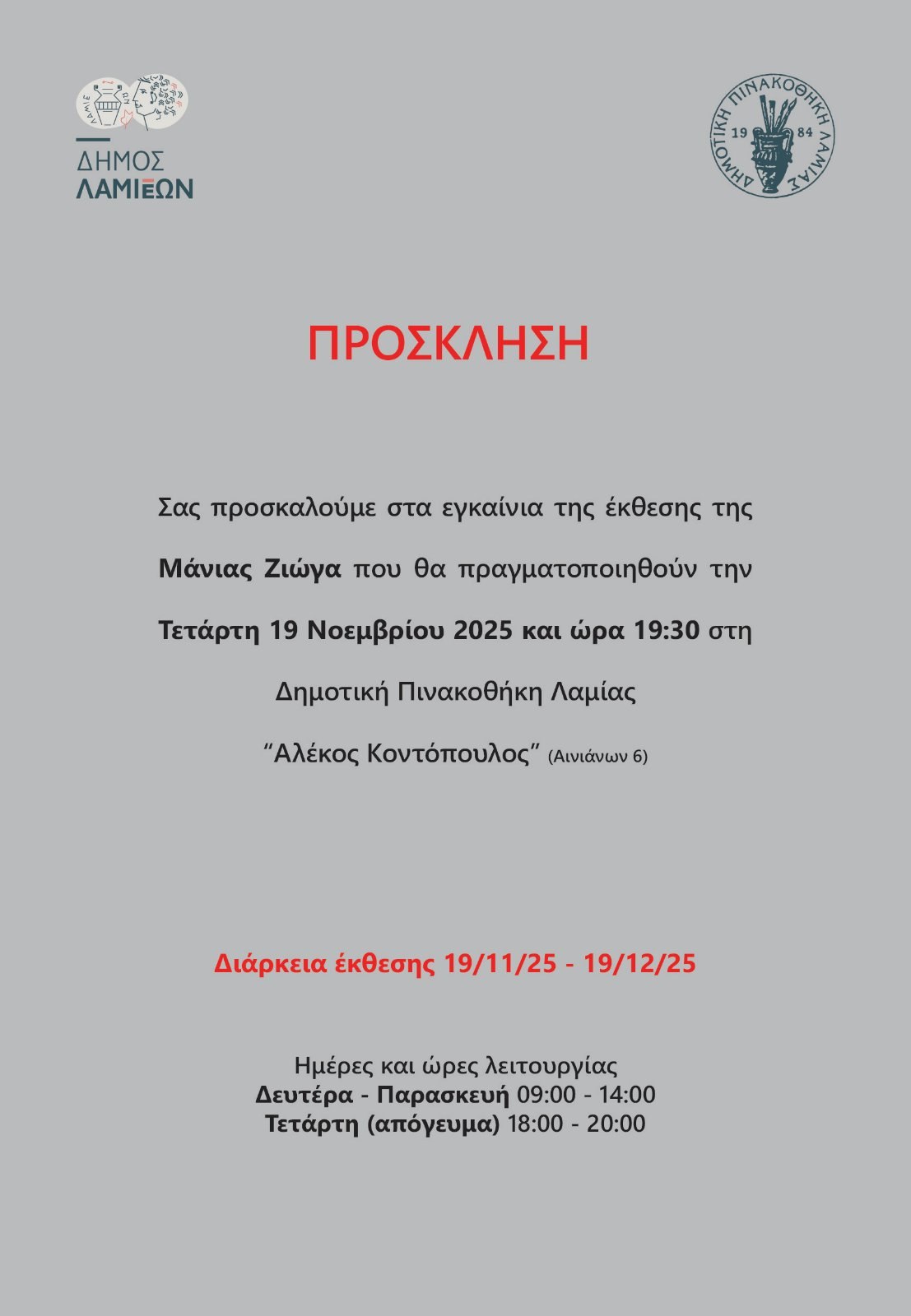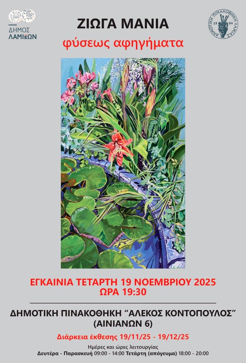 Ο Δήμος Λαμιέων και η Δημοτική Πινακοθήκη Λαμίας «Αλέκος Κοντόπουλος» εγκαινιάζουν την Έκθεση Ζωγραφικής με τίτλο: «Φύσεως Αφηγήματα» της εικαστικού Μάνιας Ζιώγα, με επιμελητή της Έκθεσης τον γλύπτη Γεράσιμο Καραντινό, στην κύρια αίθουσα της Δημοτικής μας Πινακοθήκης την Τετάρτη 19 Νοεμβρίου και ώρα 19:30.