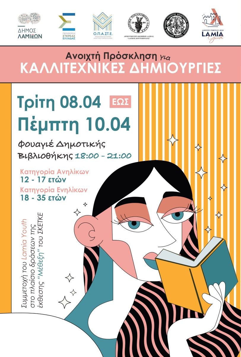 Το Συμβούλιο Νέων του Δήμου Λαμιέων Lamia Youth σας προσκαλεί στην έκθεση "Καλλιτεχνικές Δημιουργίες" που διοργανώνει σε συνεργασία με τον Σύλλογο Καλλιτεχνών Εικαστικών Τεχνών Κεντρικής Ελλάδας.