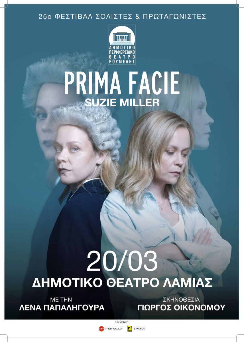 Το παγκόσμιο θεατρικό, εκδοτικό και δικαστικό φαινόμενο "PRIMA FACIE" για πρώτη φορά στην Ελλάδα, έρχεται στη Λαμία, στο πλαίσιο του 25ου Φεστιβάλ για Σολίστες και Πρωταγωνιστές σε συνεργασία με το ΔΗΠΕΘΕ Ρούμελης την Πέμπτη 20 Μαρτίου και ώρα 21:15.
