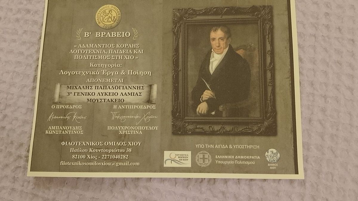Με μεγάλη επιτυχία ολοκληρώθηκε ο Πανελλήνιος Διαγωνισμός Δημιουργικής Έκφρασης «Αδαμάντιος Κοραής - Λογοτεχνία, Παιδεία και Πολιτισμός στη Χίο», που διοργάνωσε ο Φιλοτεχνικός Όμιλος Χίου, υπό την αιγίδα και τηνυποστήριξη του Υπουργείου Πολιτισμού.